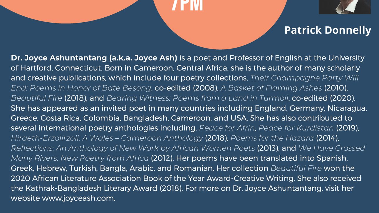 Spears Books invites you to the Wintonbury Poetry Series Virtual Reading featuring award-winning poet and professor Joyce Ashuntantang; Thursday, Feb 18, 2021, 7:00-9:30pm ET. Hosted by the Prosser Public Library/P. Faith McMahon Wintonbury Library. Register here for the event: http://bit.ly/36FTWpL Learn more about her books here